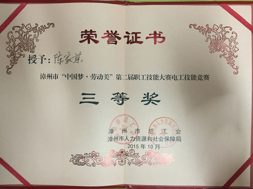 2015年10月28日,為期2天的漳州市“中國夢?勞動美” 第二屆技能大賽維修電工技能競賽圓滿落下帷幕。黃忠灼、游照輝、陳家榮、許志榕、楊文遠、李源森等6名員工代表公司參加競賽。他們在競賽中發揮出了自己的水平,其中陳家榮榮獲三等獎。