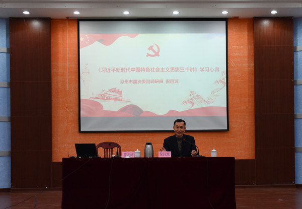 為進一步興起習近平新時代中國特色社會主義思想 “大學習”熱潮,2018年12月28日晚,龍軸集團在俱樂部會議室組織開展專題黨課講座。集團黨委書記、董事長曾凡沛作了題為《充分認識政治建設是黨的建設的首要建設》專題黨課,同時邀請漳州市國資委副調研員倪昌源講授《<習近平新時代中國特色社會主義思想>三十講學習心得》。集團高管、各黨總支、黨支部書記及支委、中層以上管理人員共130余人參加了黨課學習。