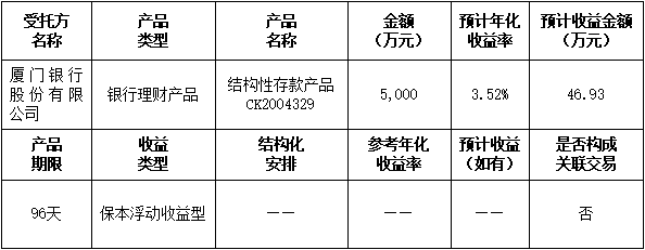 本次委托理財金額:委托廈門銀行理財5,000萬元。