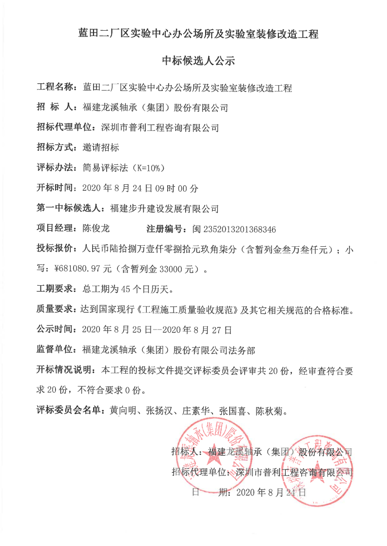 龍軸集團(tuán)藍(lán)田二廠區(qū)實(shí)驗(yàn)中心辦公場所及實(shí)驗(yàn)室裝修改造工程中標(biāo)候選人公示