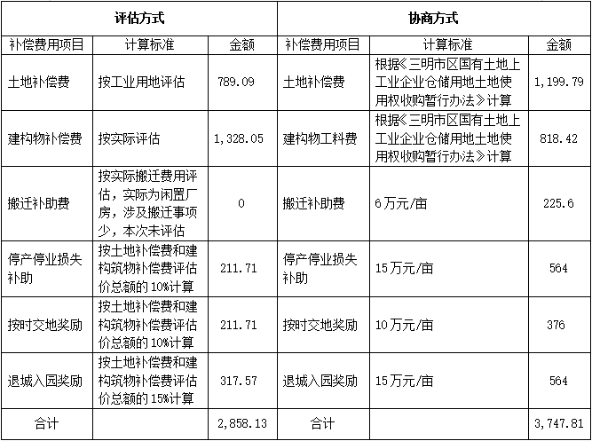 福建省三明齒輪箱有限責(zé)任公司陳大鎮(zhèn)廠區(qū)工業(yè)用地征遷補(bǔ)償方式對(duì)比表