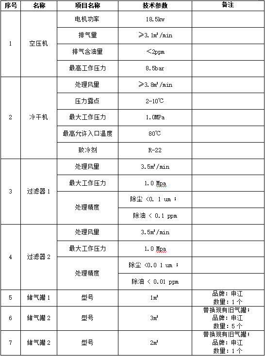 項目名稱:購置1套空壓機系統(約18.5kw,含配套冷干機、1m³氣罐、過濾器)