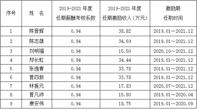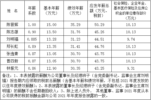 根據漳州市國資委及《公司董事長、經理班子年薪方案》的有關規定,同意公司董事長及經理班子人員(含黨委副書記、監事會主席劉明福)2021年度薪酬方案修訂如下: