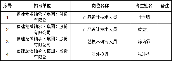 根據《福建龍溪軸承(集團)股份有限公司2022年公開招聘方案》有關規(guī)定,經面試等程序,現將公司擬聘用人員予以公示,公示期為5個工作日,公示名單如下: