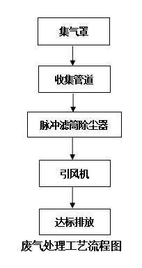 該項(xiàng)目砂帶機(jī)廢氣風(fēng)量小,主要為細(xì)小顆粒粉塵,選用脈沖濾筒除塵器處理粉塵,初步流程見下圖。