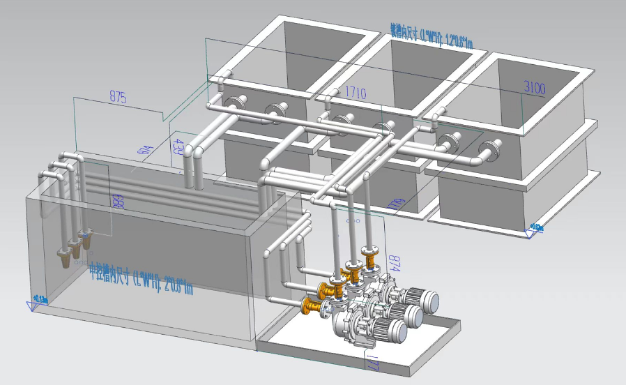 (2)每只主槽配兩路鈦制溢流管道,管與槽子焊接,槽液溢流進入中控槽液面以下100mm,并應(yīng)有防虹吸措施;底閥入中控槽離槽底距離50mm;管道平面圖和立面圖附后,圖中管道尺寸按槽子相對位置作的基本設(shè)計,可在此基礎(chǔ)上進一步優(yōu)化管道設(shè)計,實施中應(yīng)根據(jù)實際測量與安裝情況作出調(diào)整材料用量。