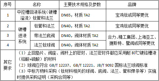 自動鍍鉻生產(chǎn)線現(xiàn)有鍍槽-中控槽鍍液循環(huán)系統(tǒng)塑料材質(zhì)管道(管道、接頭與閥體)使用到一定年限老化,其中的溢流管路、回液管路及閥件將更新為鈦材料。