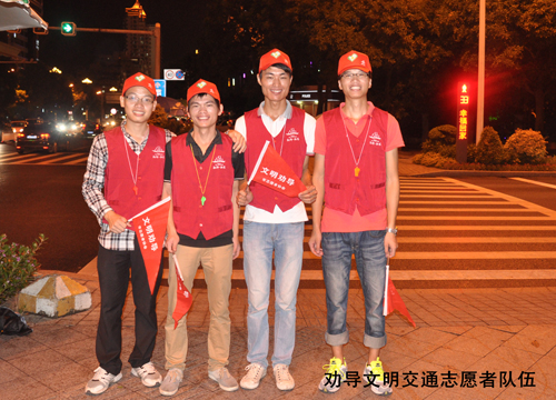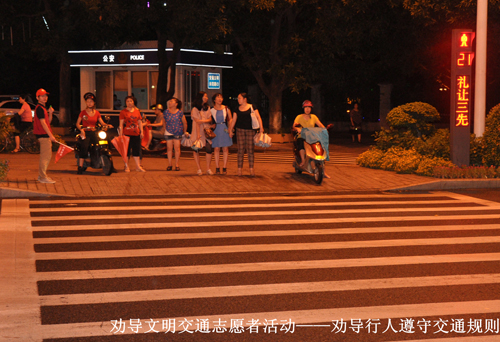 活動當晚,適逢臺風天氣影響,下起了臺風雨,但這絲毫不影響我司志愿者們的服務熱情,他們統一身著志愿服務紅馬褂、帽子,持宣傳小旗、口哨,早早地走上街頭,對闖紅燈和橫穿馬路的行人進行耐心、禮貌的勸導,制止亂扔垃圾等不文明行為的發生,讓行人自覺規范行為,樹立較強的交通安全意識和文明風尚意識。